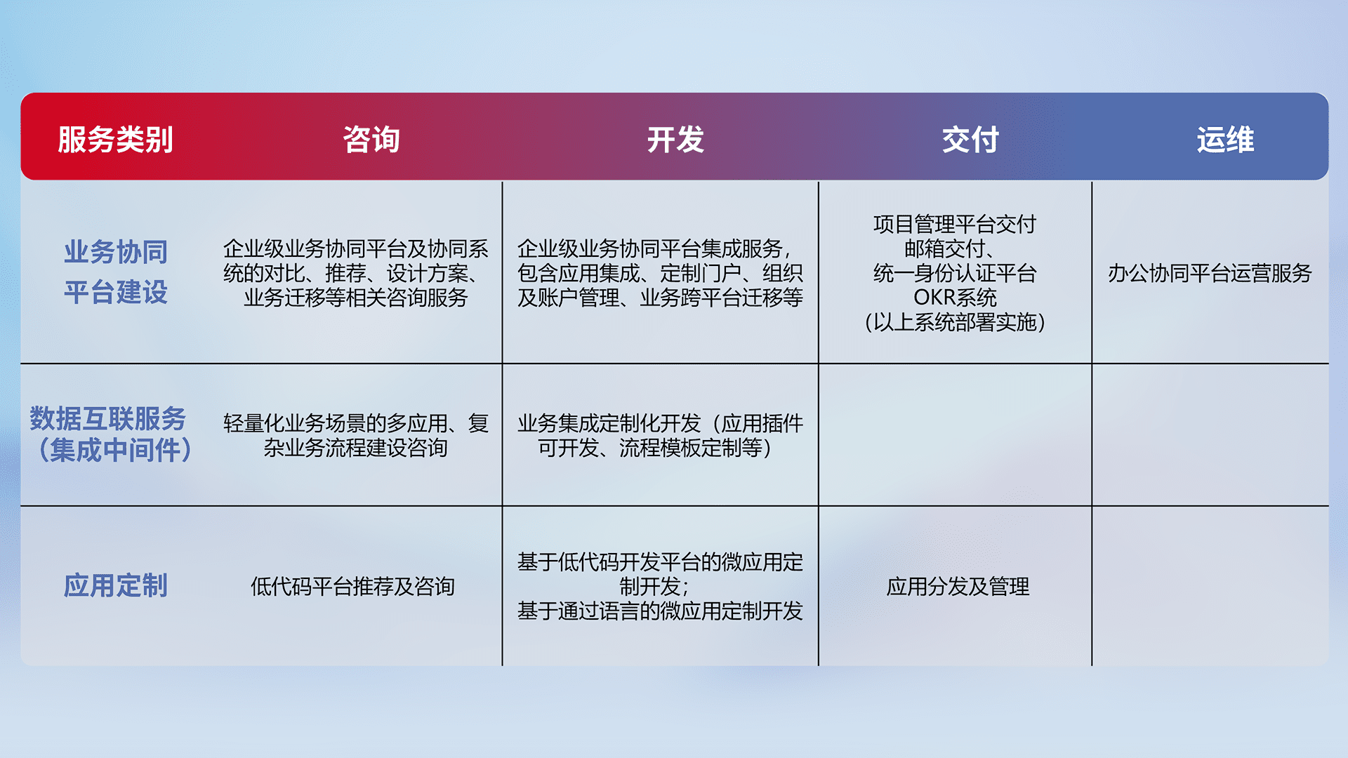 针对钉钉、、、、企微、、、IDaas等平台级产品提供产品的规划、、、方案、、交付、、、定制化开发等服务,,实现如统一协同办公、、、、智能客户服务、、、、混合会议管理、、、智能数据查询、、、、等业务场景,,,实现数字化转型。。。